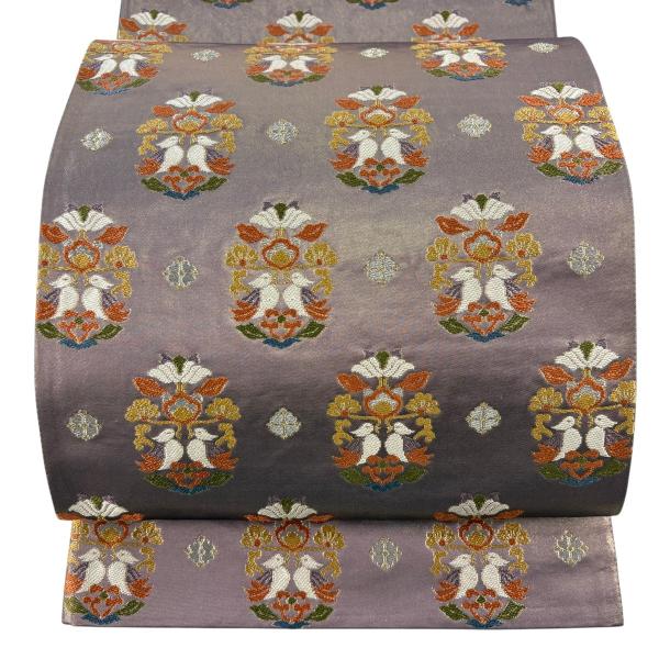 美品 袋帯 逸品 河村織物 落款あり 天平花鳥文 金銀糸 箔 紫 六通 正絹 中古
