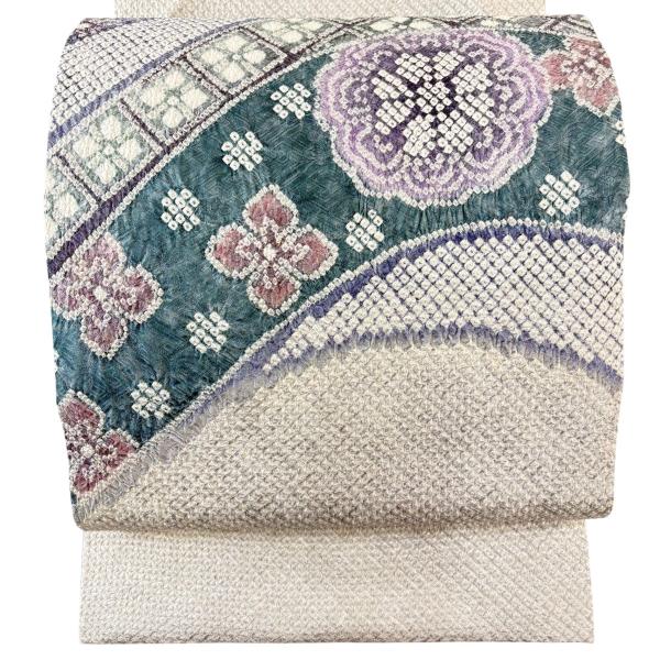 開き名古屋帯 逸品 花 菱 絞り 灰紫 正絹 中古