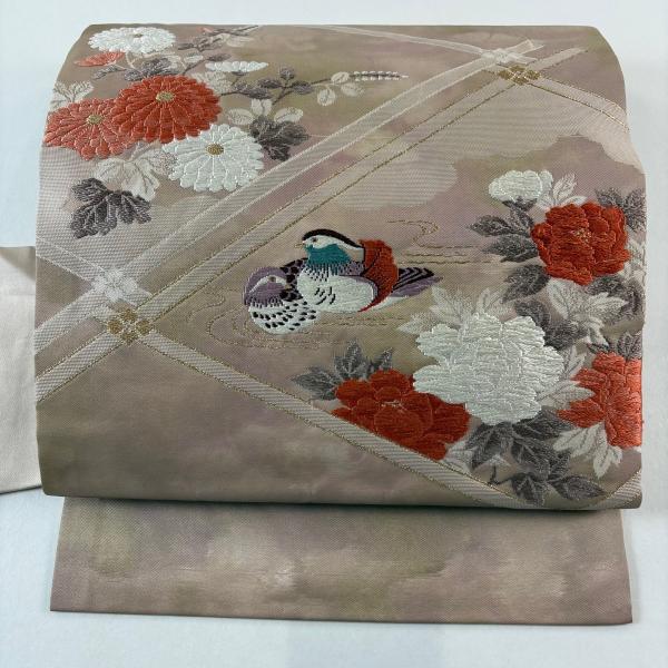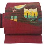 名古屋帯 優品 草花 鴛鴦 箔 薄小豆 正絹 中古