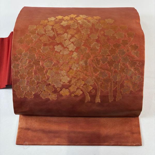 美品 名古屋帯 優品 枝梅 金糸 箔 赤茶 正絹 中古