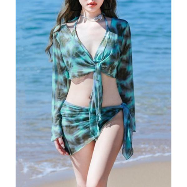 水着 タイダイ柄 長袖トップス+パレオ+三角ビキニ 水着 4点セット レディース