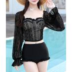 水着 レディース水着 シースルー長袖ビスチェ風バックレースハイウエストビキニ 上下2点セット レディース