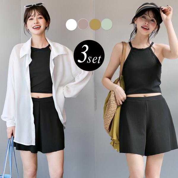 送料無料 翌日配達 あすつく 水着通販ストア水着 レディース 体型カバー 3点セット ハイネック タンキニ シアーシャツ ホルターネック ブラ キュロット ハイウエスト フレア ショーツ...
