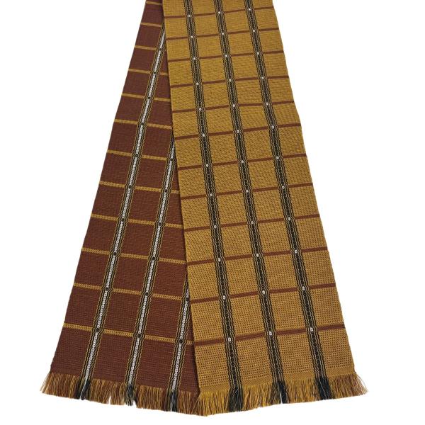 美品 半幅帯 名品 格子 山吹茶色 正絹 中古