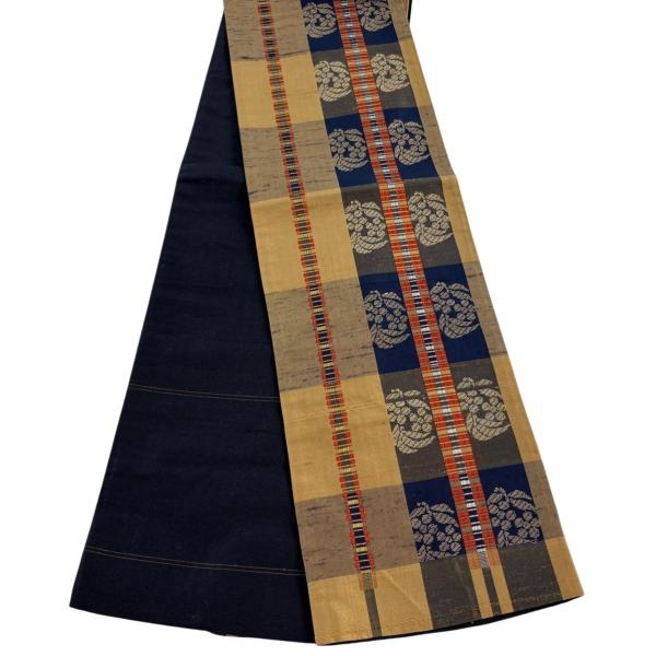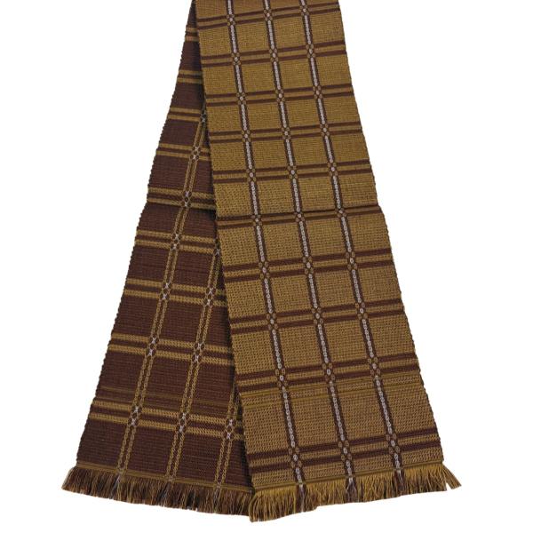 美品 半幅帯 名品 格子 黄土色 正絹 中古