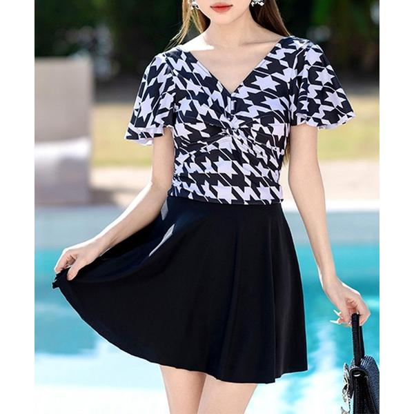 水着 レディース水着 千鳥格子柄Nネックワンピ風オールインワンスイムウェア レディース