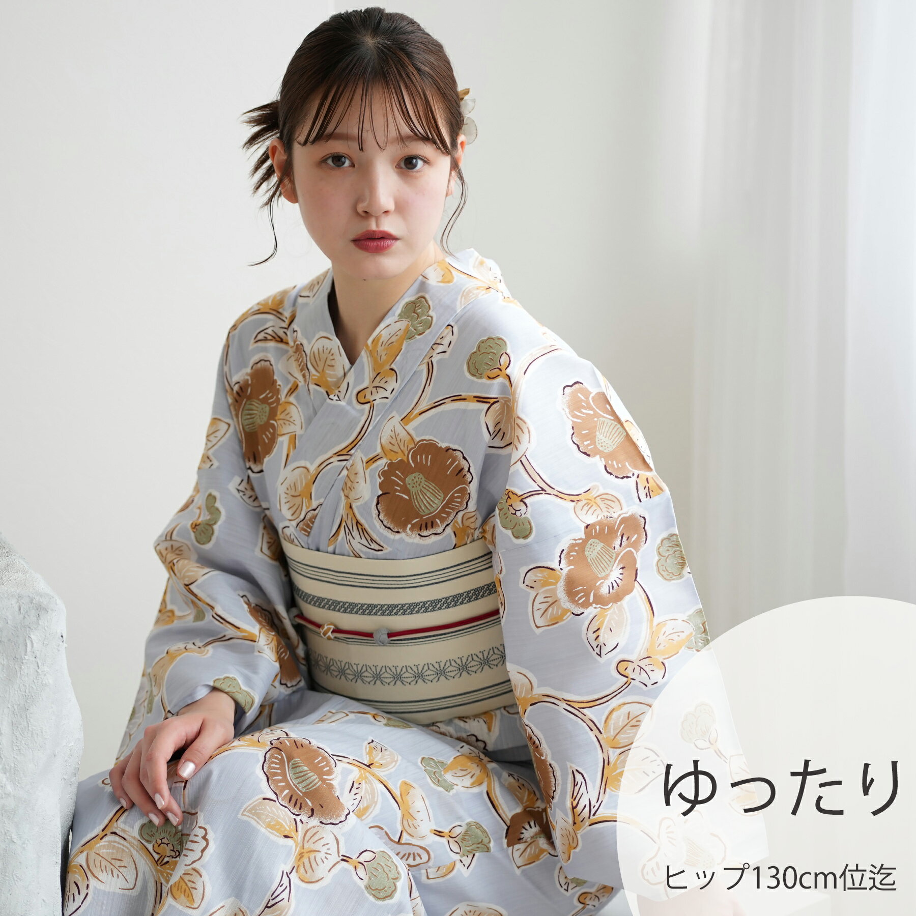 【70%OFF】【utatane 高級変わり織 浴衣3点セット 薄グレーに椿唐草】ここでしか買えない昭和初期アンティーク復刻版 ゆったりサイズ(ヒップ約130cm位まで対応)3Lサイズ 浴衣セット(ゆかた・帯・下駄)うたたね 上質 国産生地 国内染色