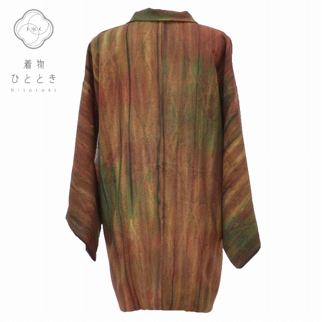 女性スタッフが運営する返品100%保証のリサイクル着物・リユース着物店商品情報 羽織 リサイクル 中古 塵除け 秋用 冬用 正絹 はおり 羽織紐付 身丈79cm 裄63.5cm 縞に雲取り文様 茶系 良...