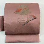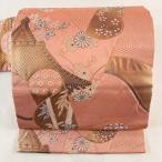 名古屋帯 優品 関西仕立て 扇 鼓 金銀糸 箔 サーモンピンク 正絹 中古