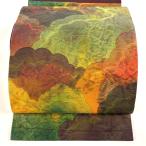 美品 名古屋帯 優品 落款あり 樹木 山並み 縮緬 金彩 薄緑 正絹 中古
