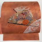 名古屋帯 優品 扇面 草花 金彩 箔 サーモンピンク 正絹 中古