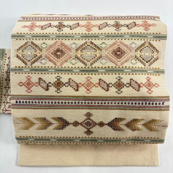 美品 名古屋帯 逸品 証紙あり 読谷山花織 草木染 縞 幾何学模様 ベージュ 正絹 中古