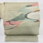 美品 名古屋帯 秀品 夏帯 流水 幾何学模様 灰緑 正絹 中古