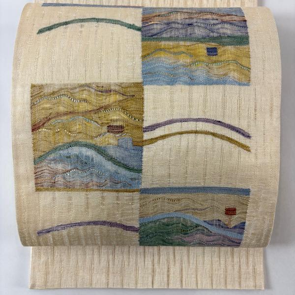 袋帯 名品 夏帯 波 幾何学模様 箔 金銀糸 ベージュ お太鼓柄 正絹 中古