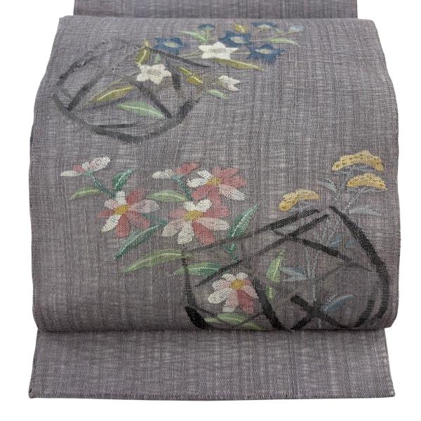 美品 袋帯 秀品 夏帯 花籠 秋草 灰紫 お太鼓柄 正絹 中古