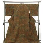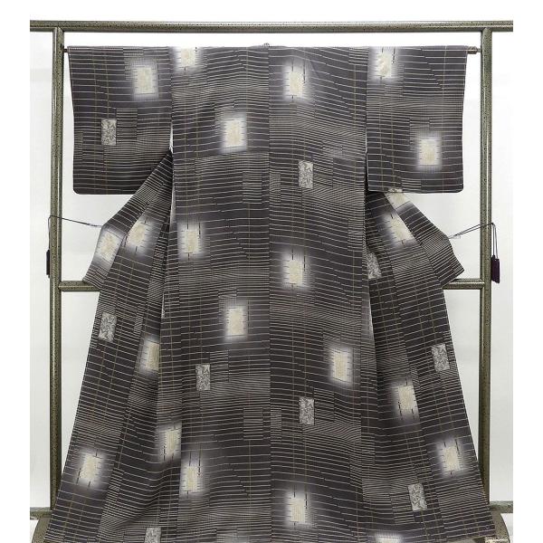 商品説明正絹・小紋です。縦縞地紋のチャコールグレー地に灰汁色や枯草色・ベージュなどと金銀箔で横縞や花模様が柄付けされています。シックで上品な小紋です。生地:正絹胴裏:...