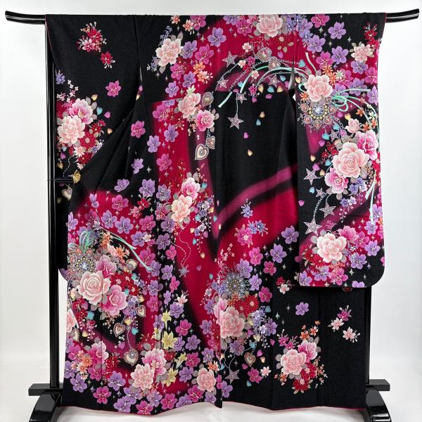 振袖 身丈165.5cm 裄丈68.5cm L 袷 薔薇 宝石 銀通し 刺繍 黒 正絹 美品 逸品 中古
