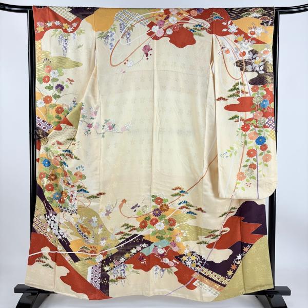 振袖 身丈159cm 裄丈62cm S 袷 貝桶 菊 金糸 金彩 ベージュ 正絹 逸品 中古