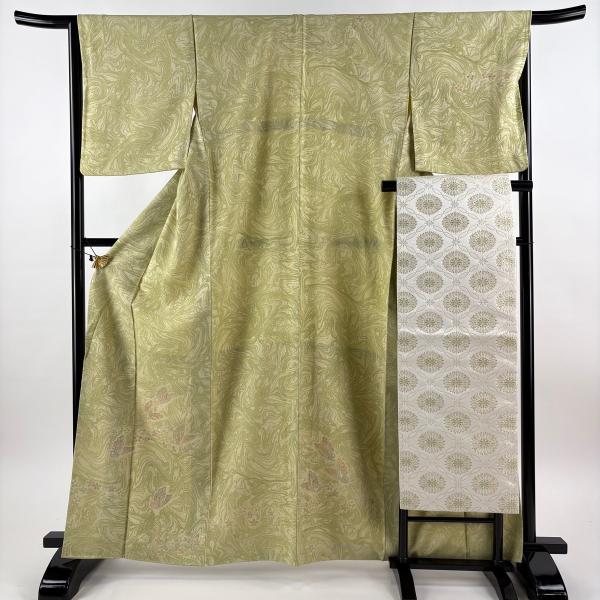 付下げ 身丈164cm 裄丈65.5cm M 袷 名古屋帯セット 蝶 墨流し 刺繍 金彩 薄緑 正絹 名品 中古