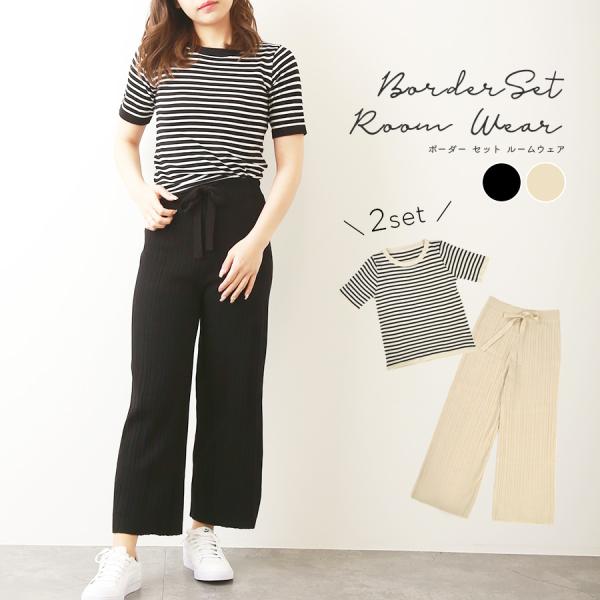 ルームウェア 部屋着 上下セット セットアップ ボーダー 半袖 パンツ トップス 韓国ファッション 春 夏 秋 新作 ブラック アイボリー フリーサイズ JOCOSA 6213