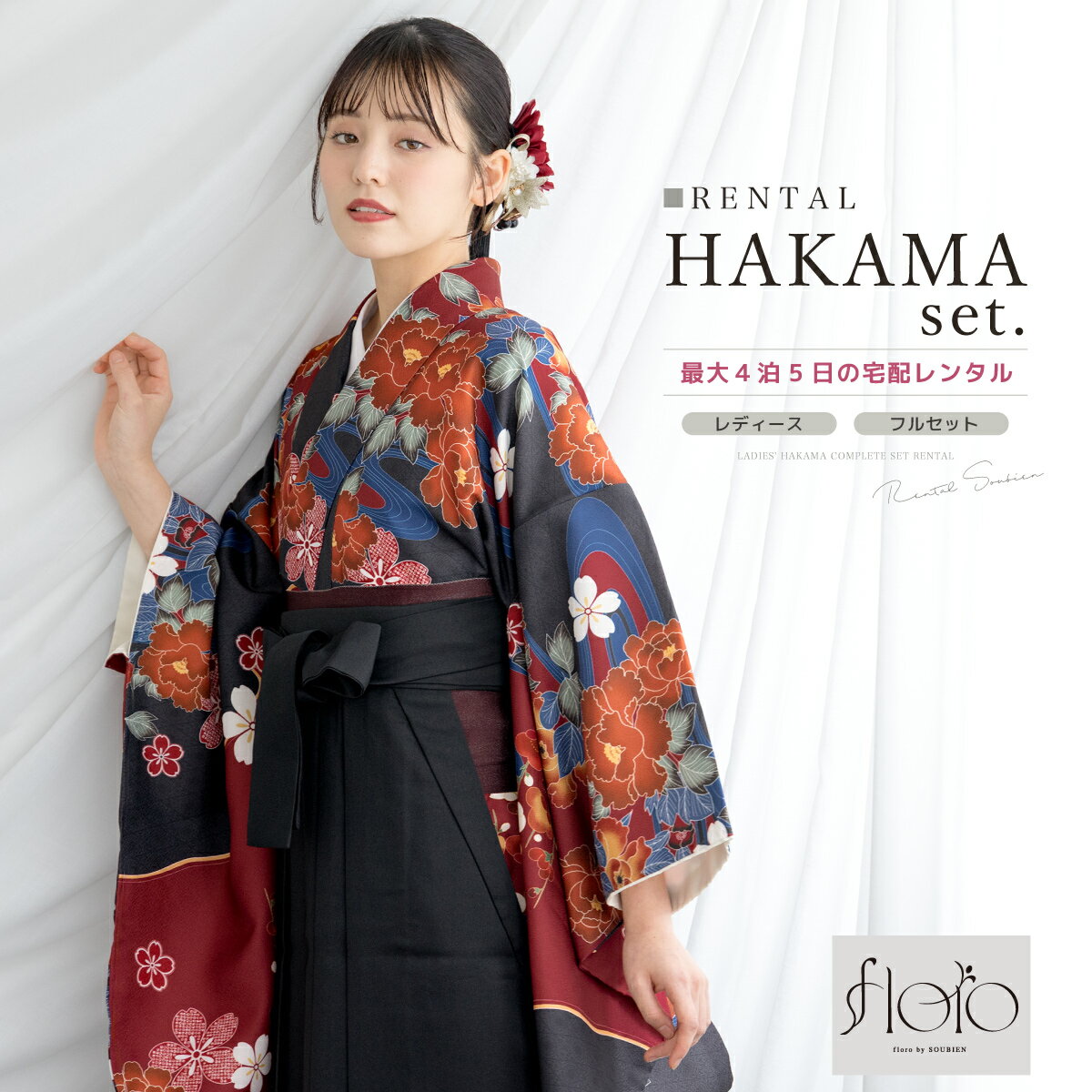 【50名限定50%OFF】最新作早割★イーグルス感謝祭特別クーポン【レンタル】袴セット 卒業式 袴 大学生 レディース フルセット floro 着物 赤 黒 絵巻 古典柄 モダン 襦袢 帯 着物セット レディース袴 140 150 160 170 創美苑 身長145から175cm対応 往復送料無料