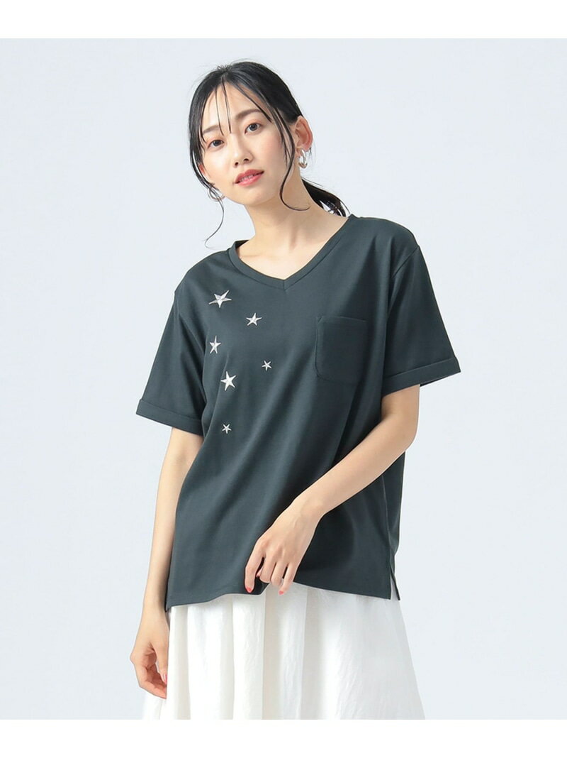 【SALE/50%OFF】BEAMS HEART WOMEN 星 刺繍 Vネック Tシャツ ビームス ハート トップス カットソー・Tシャツ ホワイト グリーン グレー