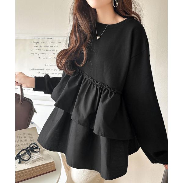 tシャツ 今年注目のトレンドアイテム!アシンメトリー異素材切替ティアードフリル裏毛トップス レディース