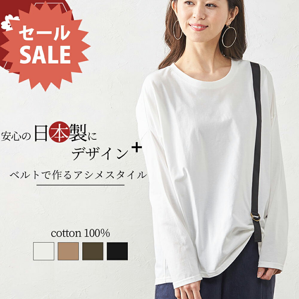 【50%OFF★タイムセール】日本製 ベルト付きカットソー 綿 綿100% コットン トップス Tシャツ アシンメトリー 個性派 おしゃれ レディース カジュアル ゆったり 春 夏 秋 冬 jf 9180531
