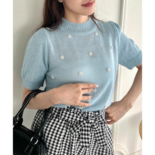 tシャツ フラワーパールパフスリーブトップス レディース