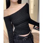 tシャツ ラインストーンロゴワンショルダーロンT レディース