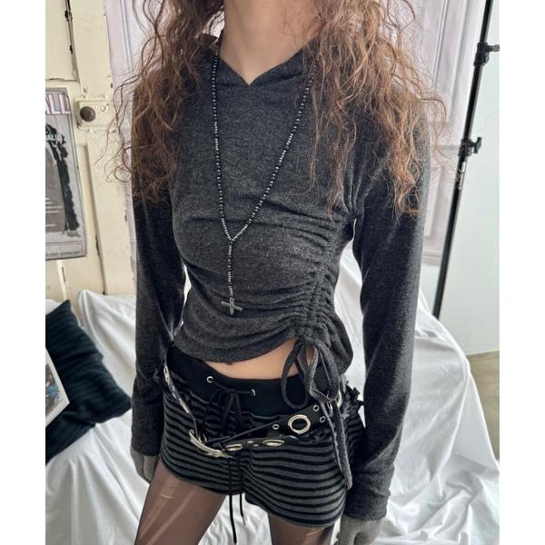 tシャツ 「ViVi掲載」ラインストーン付きサイドシャーリングフーディトップス レディース