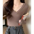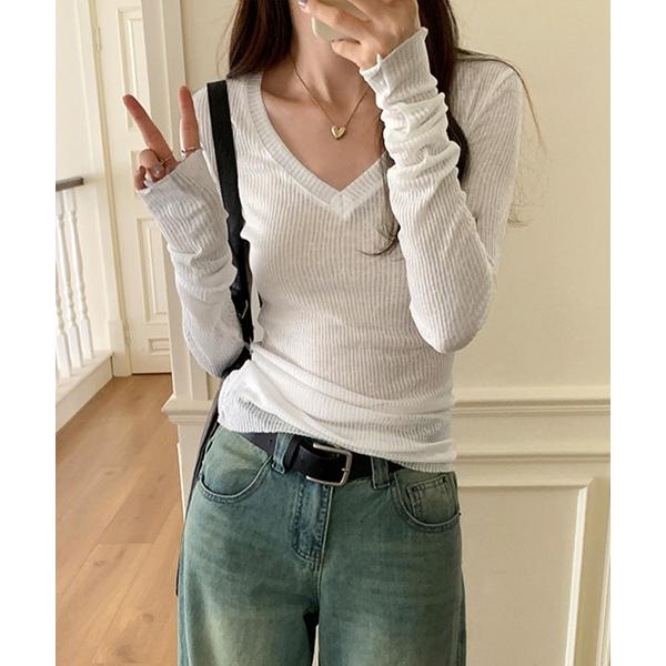 tシャツ 透け感Vネックリブトップス レディース