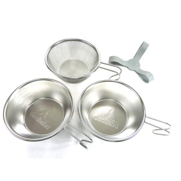 Gaobabuシェラカップ300mlの2個セットに、シェラカップ型ザル1個と収納バンドをおつけしました。全てがスタッキングしたまま持ち運べる、便利でお得なセットです。ソロキャンプなどシ...