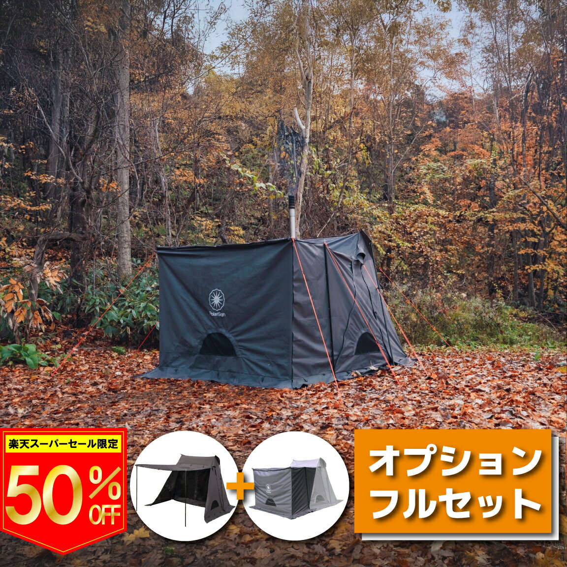 TC素材で難燃性。煙突口も標準装備 薪ストーブも使えるソロからデュオまで対応するテント 前幕オプションもセットで広すぎる前室空間も確保できます セット購入でのお得なセットPola...