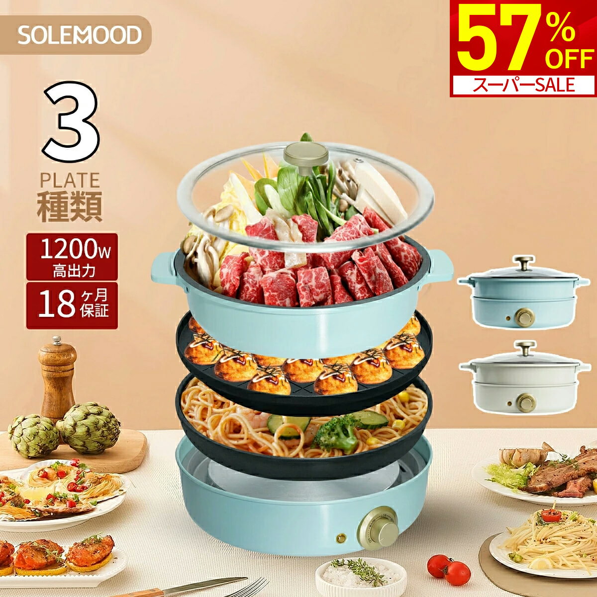 【スーパーSALE限定★57%OFF!】 ホットプレート 3種プレート 付き SOLEMOOD 鍋 焼肉 電気 大型 深型 マルチ グリルポット たこ焼き器 深鍋 煮る 焼肉プレート 一人用 焼く 蒸す コンパクト 鉄板焼き器 グリル鍋 おしゃれ かわいい 炒め物 新生活 父の日