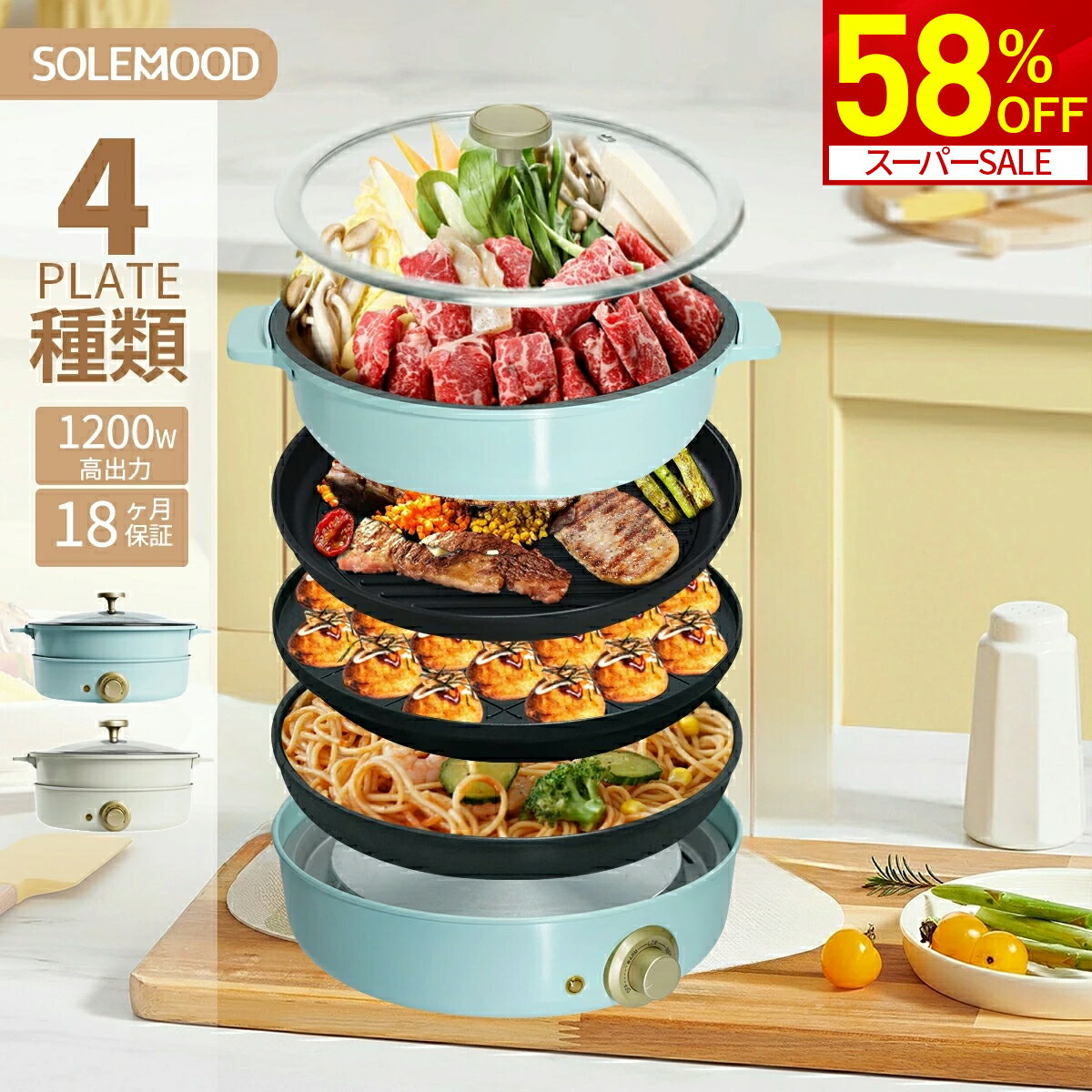【スーパーSALE限定★58%OFF!】 ホットプレート グリル鍋 ホットプレート 鍋 電気鍋 4人用 大型 4種プレート マルチ グリルポット たこ焼き器 たこ焼きプレート 煮る 焼く 蒸す 多機能 ひとり暮らし おしゃれ かわいい 可愛い 料理鍋 深型 SOLEMOOD 新生活