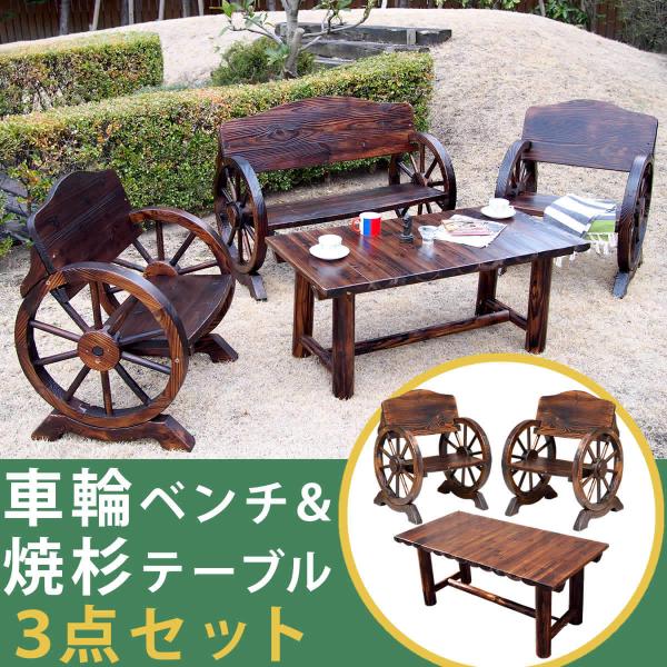 幅110cmの車輪ベンチ(大)、幅65.5cmの車輪ベンチ(小)、幅110cmの焼杉テーブルの計3点がセットになったガーデンテーブルセットです。■商品内容:テーブル×1台、車輪ベンチ(大)×1脚、車輪...