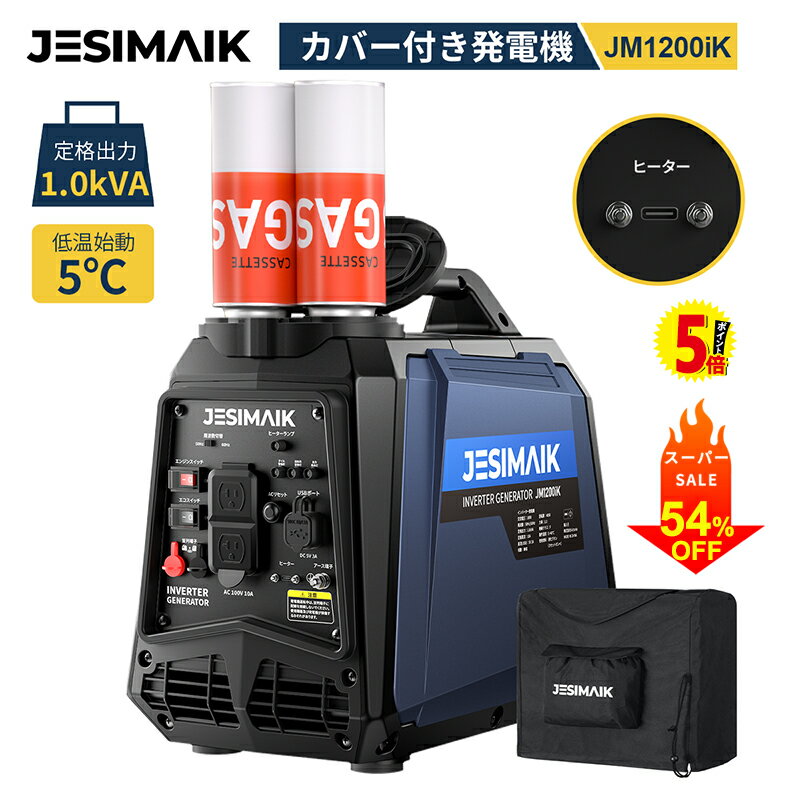 【スーパーSALE!53,200円相当★P5倍+54%OFF】 JESIMAIK 発電機 カセットボンベ カバー付 低温始動 5℃ インバーター発電機 ガス 1000W OD缶 発電機 小型 家庭用 カセットガス AC/USB出力 災害 防災 ポータブル 並列運転 純正弦波 持ち運び便利 低騒音 非常電源 JM1200iK