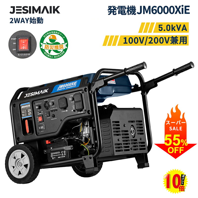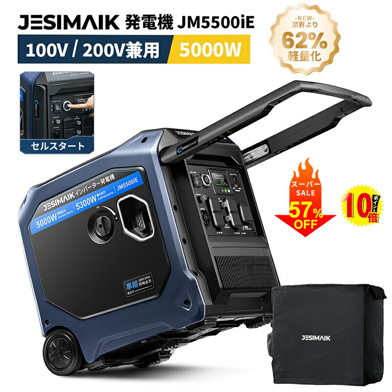 【スーパーSALE!140,850円相当★P10倍+57%OFF】 JESIMAIK カバー付 発電機 インバーター JM5500iE 5.0kVA セルスターター 単相100V/200V 収納型ハンドル キャスター付 ガソリン発電機 防音 キッチンカー 園芸 ドローン充電 DIY 工事 災害 停電 エアコン電源 家庭用