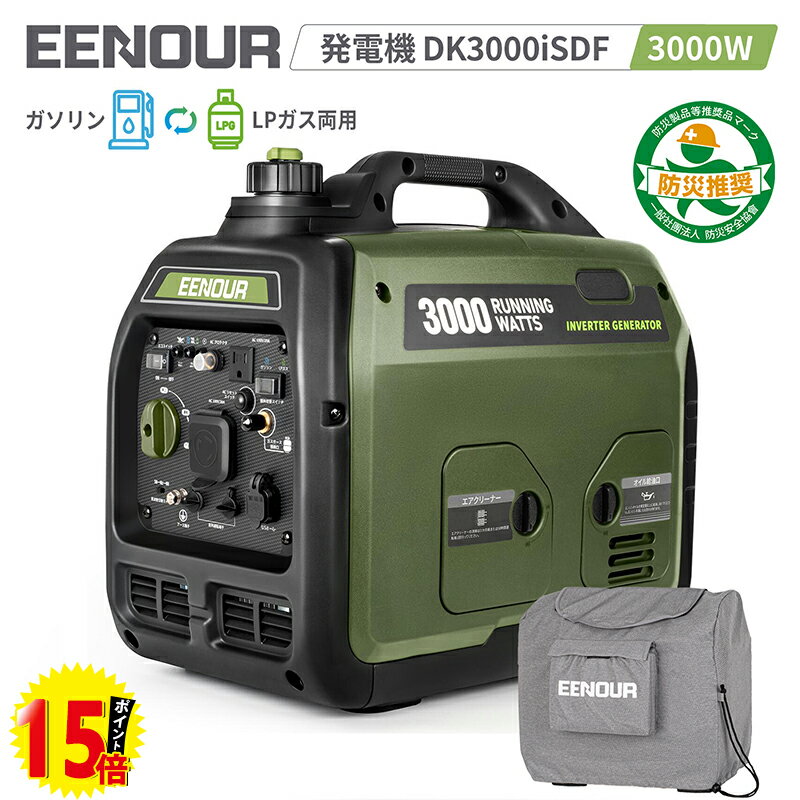 【大感謝祭終了直前!26日迄98,600円相当★P15倍&53%OFF】 EENOUR カバー付 LPガス・ガソリン両用 発電機 インバーター DK3000iSDF PSE認証/PL保険加入済 ガス発電機 3.0kVA インバータ発電機 プロパンガス ガス発電機 正弦波 工事 キッチンカー 台風 停電 非常用電源