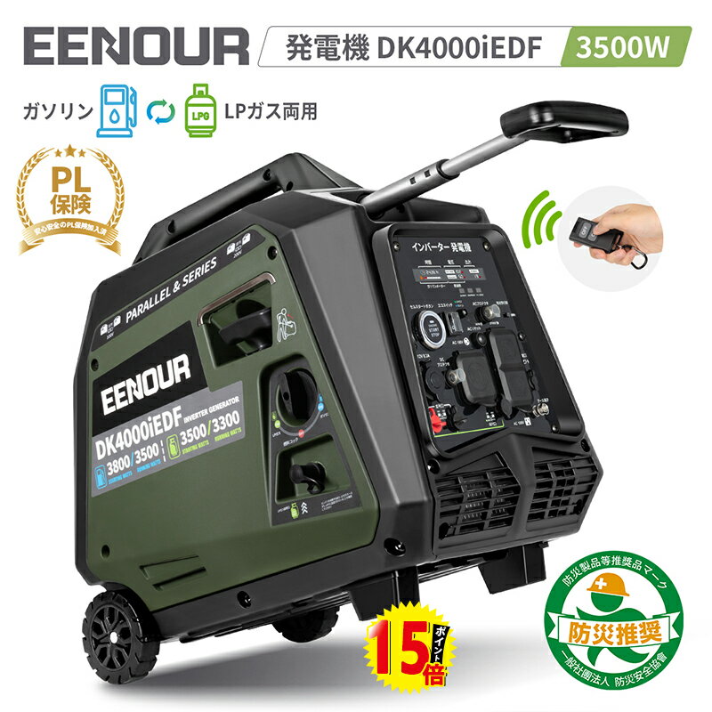 【大感謝祭終了直前!26日迄144,415円相当★P15倍&57%OFF】EENOUR 3way始動 発電機 インバーター 災害 静音 両用 LPガス/ガソリン発電機 リモコン/キャスター付 DK4000iEDF 4.0kW 並列/直列運転 200V プロパンガス ガス発電機 家庭用 防災 キッチンカー 園芸 PL保険加入