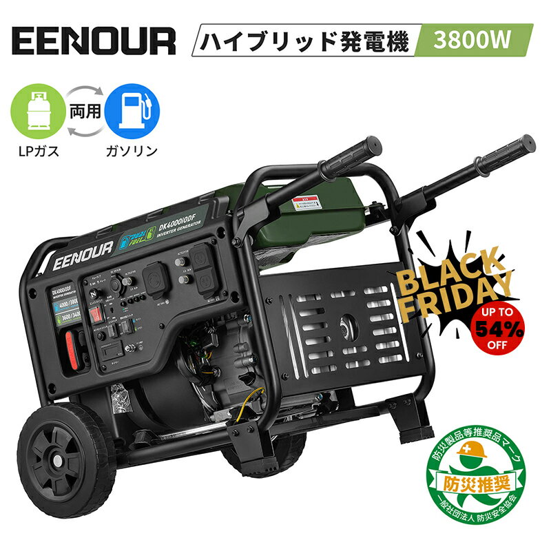 【Black friday抽選P100%返還+81,747円相当★P7倍+54%OFF】 EENOUR LPガス・ガソリン両用 発電機 インバーター 家庭用 キャスター付 3800W DK4000iODF 正弦波 エンジン発電機 プロパンガス 非常用電源 防災 台風 地震 工事 DIY キッチンカー 農業用 PL保険加入