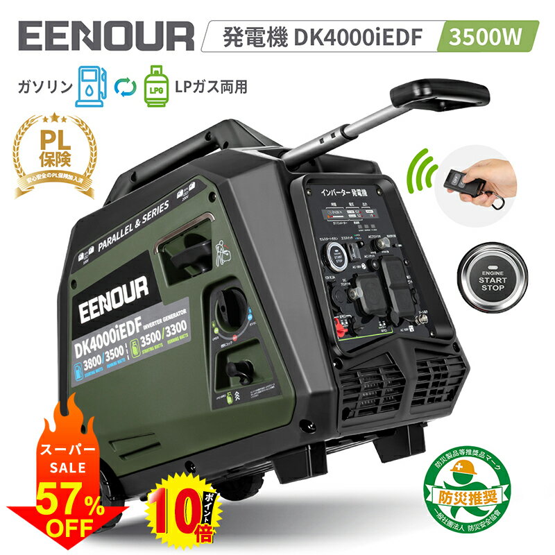 【スーパーSALE!1/2当選率抽選P100%返還+P10倍+57%OFF】EENOUR 3way始動 発電機 インバーター 災害 静音 両用 LPガス/ガソリン発電機 リモコン/キャスター付 DK4000iEDF 4.0kW 並列/直列運転 200V プロパンガス ガス発電機 家庭用 防災 キッチンカー 園芸 PL保険加入