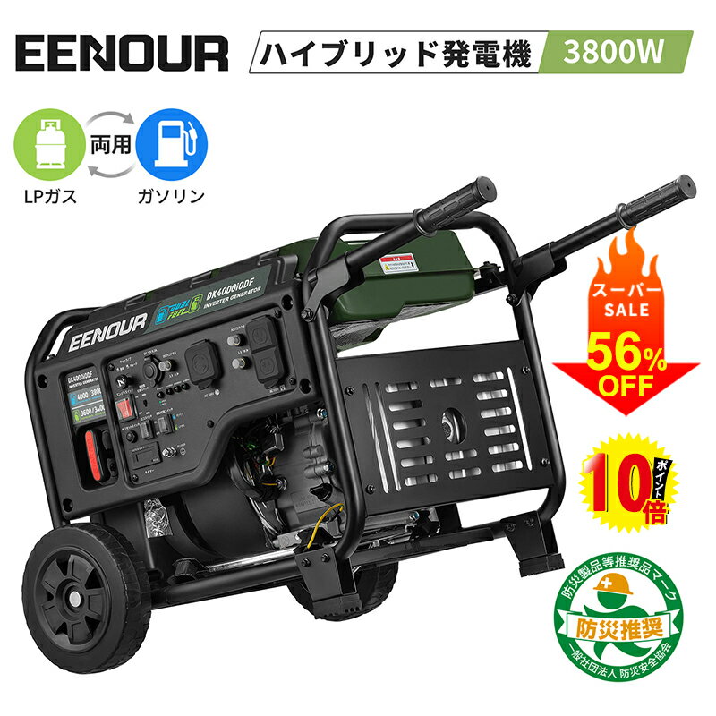 【スーパーSALE!1/2当選率抽選P100%返還+P10倍+56%OFF】 EENOUR LPガス・ガソリン両用 発電機 インバーター 家庭用 キャスター付 3800W DK4000iODF 正弦波 エンジン発電機 プロパンガス 非常用電源 防災 台風 地震 工事 DIY キッチンカー 農業用 PL保険加入