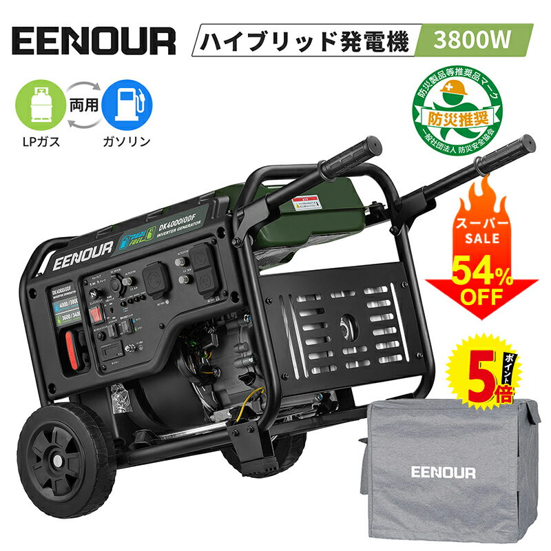 【スーパーSALE!抽選P100%返還+85,025円相当★P5倍+54%OFF】 EENOUR ガソリン/LPガス両用 カバー付 発電機 インバーター 家庭用 キャスター付 3800W ガス発電機 DK4000iODF 正弦波 エンジン発電機 プロパンガス 台風 地震 工事 DIY キッチンカー 農業用 非常電源 PL保険加入