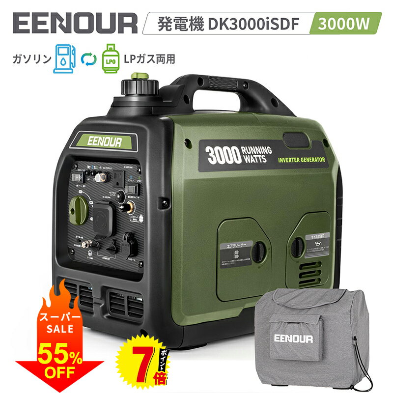 【スーパーSALE!抽選P100%返還+103,230円相当★P7倍+55%OFF】 EENOUR カバー付 LPガス・ガソリン両用 発電機 インバーター DK3000iSDF PSE認証/PL保険加入済 ガス発電機 3.0kVA インバータ発電機 プロパンガス ガス発電機 正弦波 工事 キッチンカー 台風 停電 非常用電源