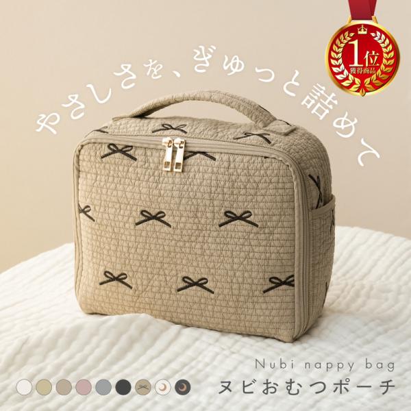 【クーポンでさらにお得!】【Yahoo1位】おむつポーチ 全3色 ヌビポーチ リボン刺繍 大容量 大きめ 小物入れ おむつ入れ おしり拭き おしゃれヌビ オムツポーチ