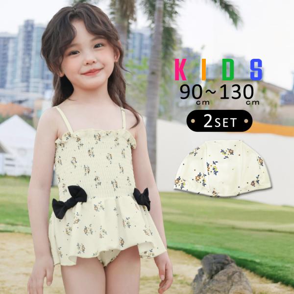 キッズ 水着 女の子 ワンピース オールインワン リボン 花柄 キャミソール スイムキャップ 2点セット かわいい