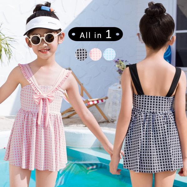 メール便送料無料 水着通販ストア キッズ 水着 ワンピース オールインワン 女の子 キャミソールワンピース ショートパンツ一体型 フリル リボン ギンガムチェック Aライン 裏地付き パ...