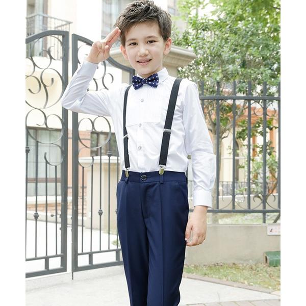 キッズ フォーマル 男の子 スーツ 長袖 シャツ 無地 チェック パンツ サスペンダー クリップエンド 蝶ネクタイ バックル 4点セット 黒